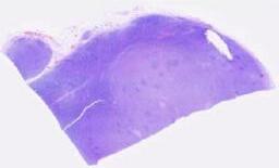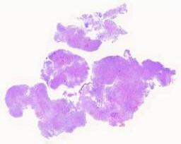 大体所见: 左侧腋窝淋巴结:灰白灰黄不整形组织一块,大小10.5x7x3cm,可见包膜,切面灰白、实性、质细腻。