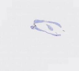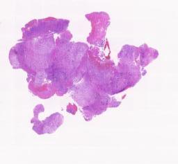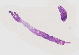 大体所见: 取材明细:(穿刺组织) 灰白灰黑穿刺组织一条,长1.2,直径0.1cm,另见灰白灰黑组织一块,大小0.2cm×0.1cm×0.1cm,质软,全取。