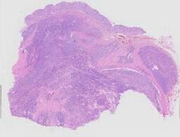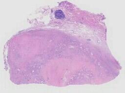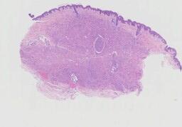 大体所见: 带梭形皮瓣的组织一块,大小1.4cm×0.7cm×0.6cm。切面灰白、实性、质中。
