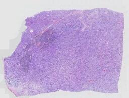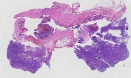 大体所见: 切除之(左下叶)肺组织,大小13×7.5×3.2cm,表面灰白灰褐色,尚光滑。吻合钉长6cm,支气管断端长2cm,断端直径0.6-0.8cm,支气管旁扪及淋巴结1枚;距支气管断端约3cm,紧邻肺膜下见一肿物,临床已剖开,大小1.7×1.7×0.9cm,边界尚清,未见包膜,对应肺膜皱缩,切面灰白、灰褐,质中;余肺实质切面灰红灰褐,质软。