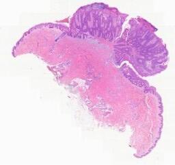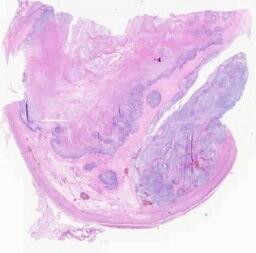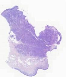 大体所见: 带皮组织一块,皮瓣大小约1.5×0.8cm,其上见一灰褐色凸起,大小约1×0.4cm,高出皮面约0.6cm,表面呈乳头状,基底切缘绿染。