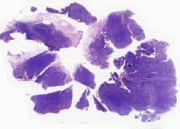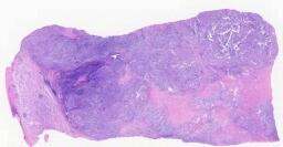 大体所见: 送检灰白灰褐色不规则组织一块,大小约8.7×6×3.5cm,切面可见灰白间灰黄色包块一个,大小约5×4.5×3.5cm,切面灰白灰黄色,质中等。