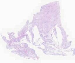 大体所见: 送检“右附件及肿瘤”:灰白灰褐色破碎不整形组织一堆,总体积10cm×9cm×6cm,其中可见卵巢增大,呈囊实性,多方,囊内见水样及胶冻样物质,囊壁见大量菜花样新生物,质脆