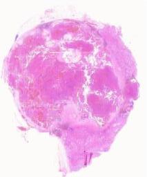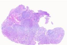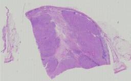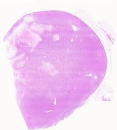 大体所见: 送检灰白灰红组织一块,大小3.6cm×3.0cm×2.2cm,切面见一结节,大小2.5cm×2.3cm×2.3cm,切面灰白灰黄,质软,与周围组织分界清;周围带少量脂肪组织,大小4.0cm×2.0cm×0.7cm,切开未见特殊。