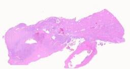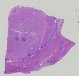 大体所见: 肾实质呈蜂窝状,内见大量凝血样坏死物,间隔内局灶可见质硬区