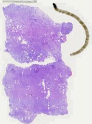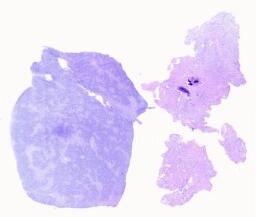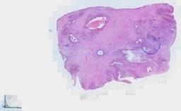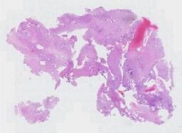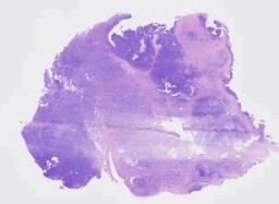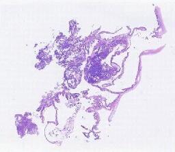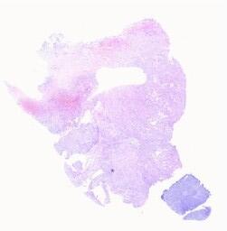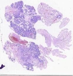 大体所见: (右侧)附件区肿瘤体积为7*6*6cm,表面分布灰红色乳头样物0.2-1cm不等,呈胶冻样,肿瘤切面囊性为主,壁灰红色,壁厚0.1-0.4cm,实性区呈灰红色乳头样隆起,范围约2*1cm,略透明。输卵管长4cm,直径0.3-0.7cm。(左侧)输卵管伞端处见一灰白色结节样肿物,体积为1*0.8*0.5cm,切面灰白色,实性,质略硬,卵巢大小2*0.8*0.4cm,表面可见散在灰红色细小乳头样物,略透明。B0358998-2(右侧)B0358998-17(左侧)